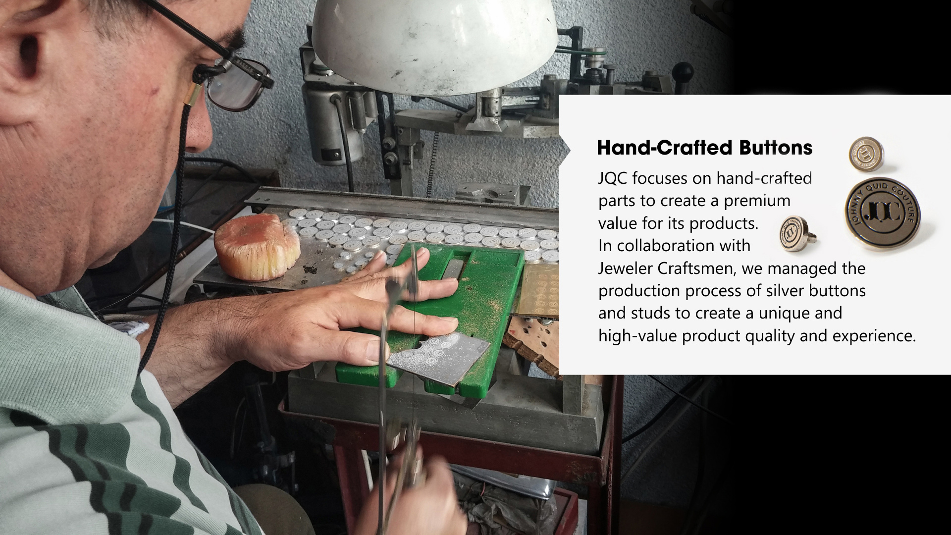 JQC asked us to design and manage the production of hand-crafted parts to create a premium value for its products. In collaboration with Jeweler Craftsmen, we managed the production process of silver buttons and studs to create a unique and high-value product quality and experience.